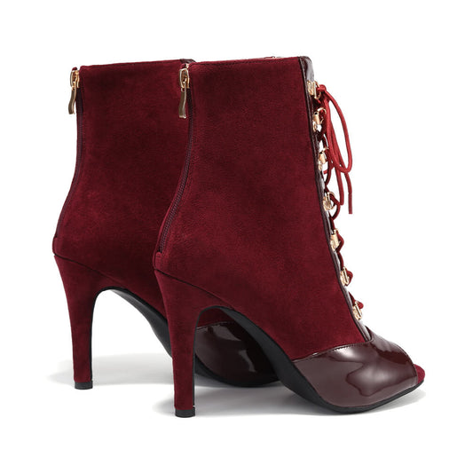 • Dark Red Peep Toe Suede Heeled Boots