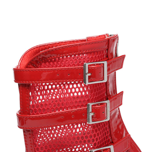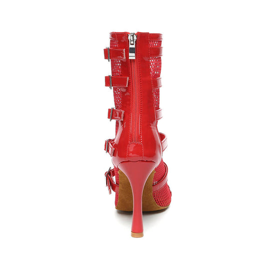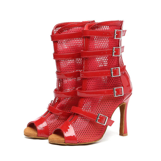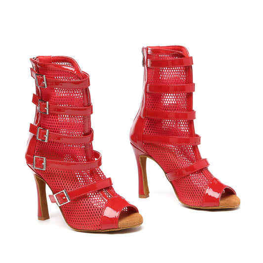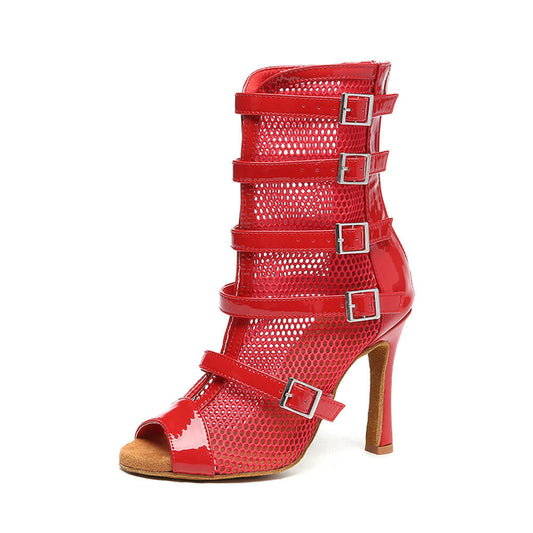 Women's Fishnet Dance Boots with Red Buckle Mesh