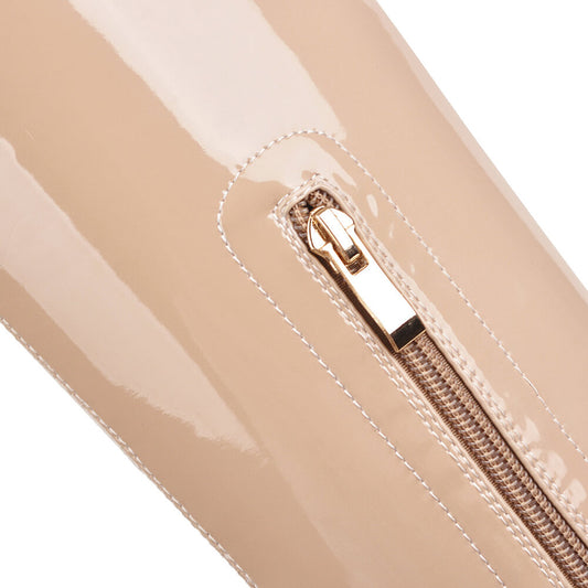 • Stivali stiletto in pelle verniciata beige con lacci anteriori in rete