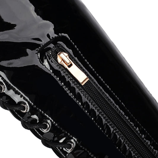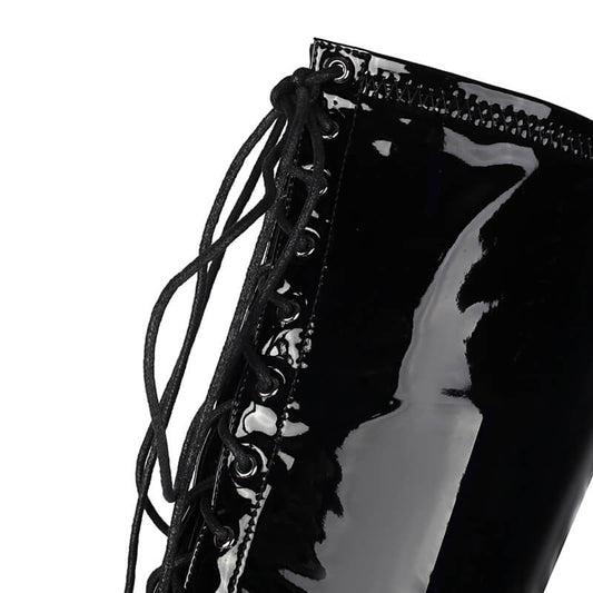 • Stivali neri sopra il ginocchio con lacci e punta affilata