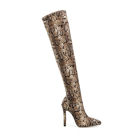 Stivali sopra il ginocchio con stampa serpente e tacco a spillo